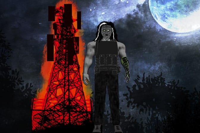 Closeup of PSYCHO KILLER (DARK REVEAL) walking towards the reader in full combat gear as a COMM ARRAY goes up in flames in the background.